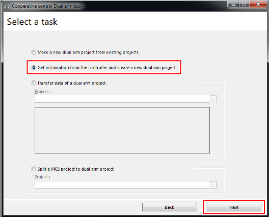 Select [Get information from the controller and create a new dual arm project.], and then click [Next].