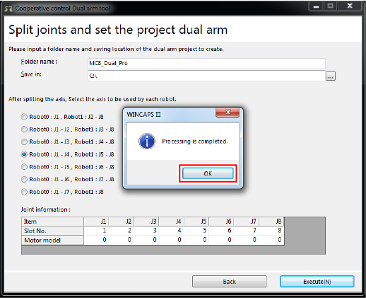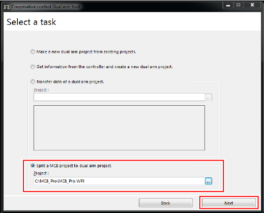 Select "Split a MC8 project dual arm project". In the [Project] text box, enter the project file (extension : wpj) of project data that you have just created. For the project file entry, enter the folder path of the target project file with the absolute path.
