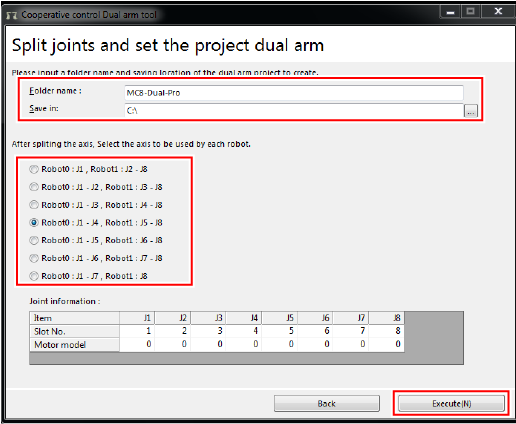 If the number of joints you use is 7 or less, check out the number of joints used for Robot0. If you use Robot0 as a 3-axis robot, Robot1 as a 4-axis robot, Robot0 occupies three joints. Therefore, select