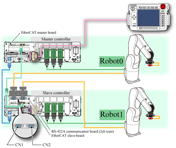 In the figure above, the force sensor of Robot0 is wired to CN1(hereafter, Robot1:RS422A-CN1) of the RS-422A communication board (for 2ch) which is installed in the robot controller of Robot1.