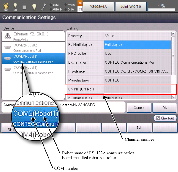 As the force sensor of Robot0 is wired to Robot1: RS-422A_CN1, from the figure above, you will see that the COM number is "3".