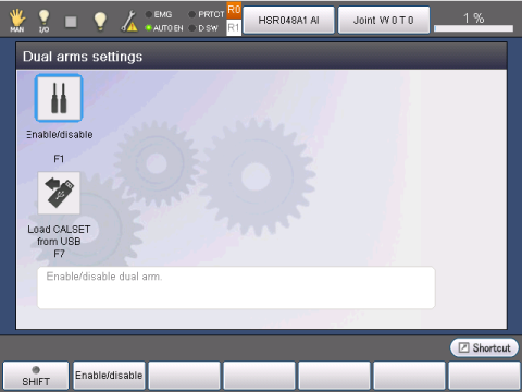 Operation path : Top window - [F6 Settings] - [F10 Dual arms]