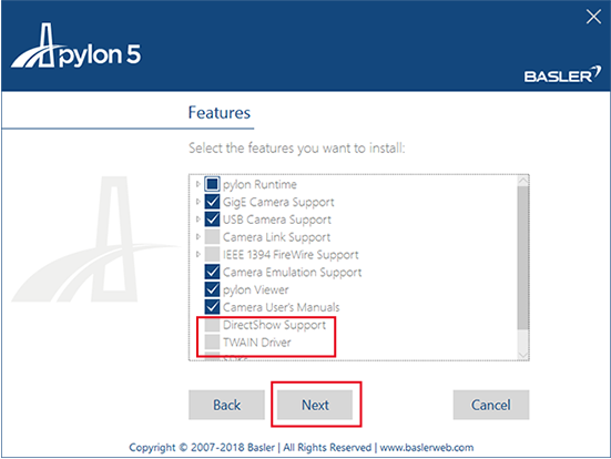 From the Features setting area, deselect the "DirectShow Support", "TWAIN Drive", and "Firmware Updater”. Click the "Next” button.