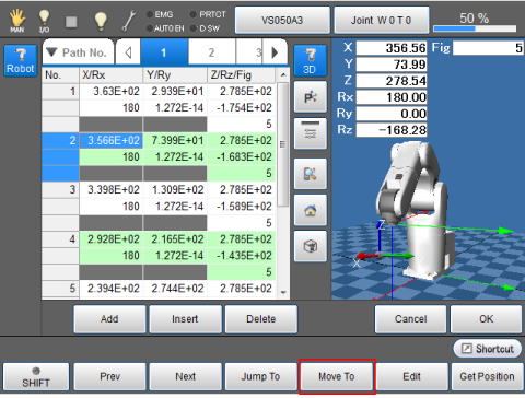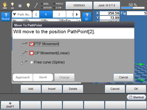Pressing [Move To] displays [Mote To PathPoint] window. Select [PTP Movement] or [CP Movement (Linear)].