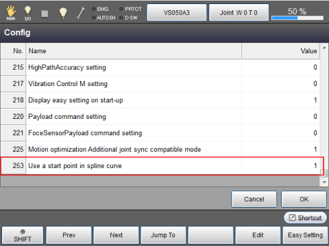 For operating the robot with free curve motion in the [Path Points Setting] window, you need to set [253: Use a start point in spline curve] to (1: Enable).