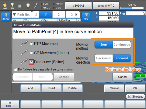 If the first and the last path points are the same position, or if the path goes through an identical path point twice or more with different robot posture, when you perform [F4: MoveTo] - [Move To PathPoint] - Free curve (Spline), the robot may move unexpected way.