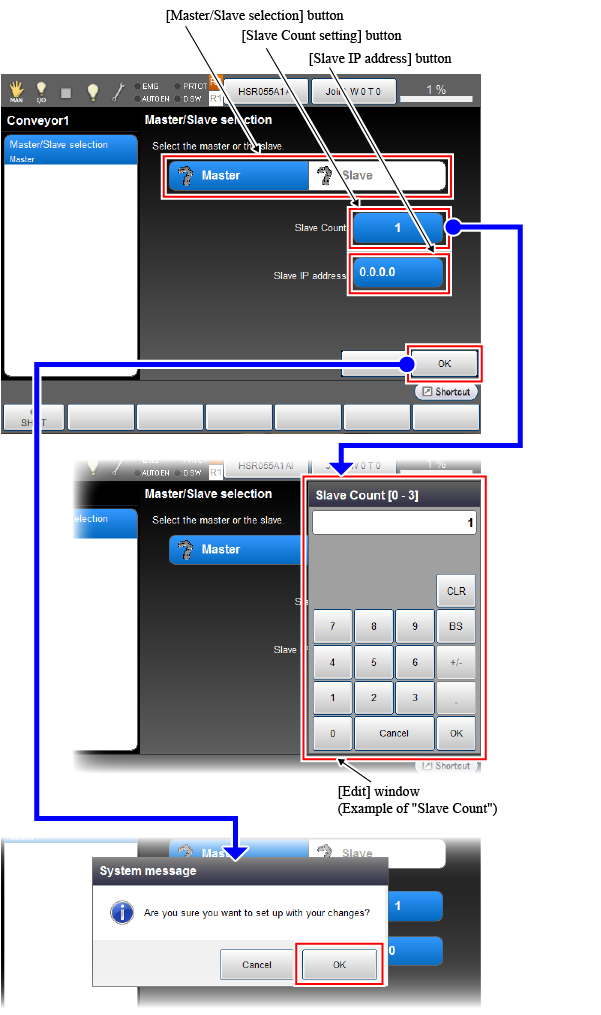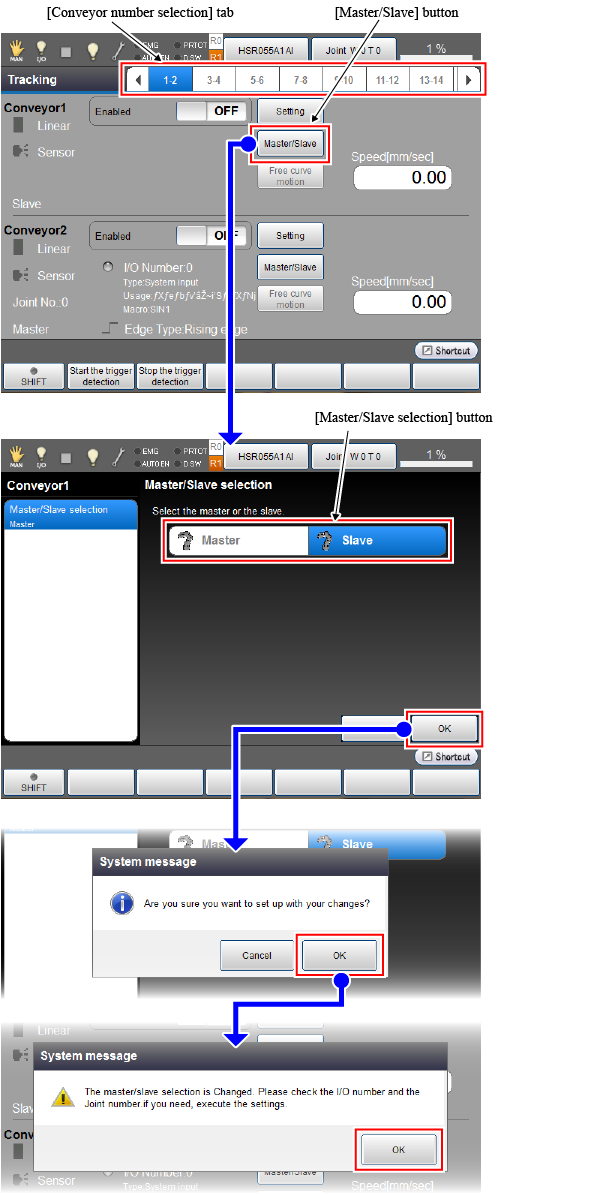 If you change the conveyor's state from Slave to Master, when you press the [OK] button on the [Master/Slave Selection] window, two system messages are displayed in sequence. For each system message, press [OK] to back to the [Tracking] window.