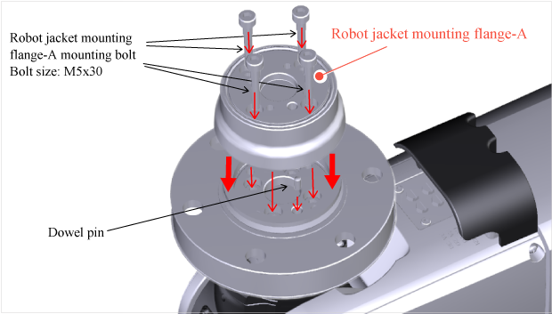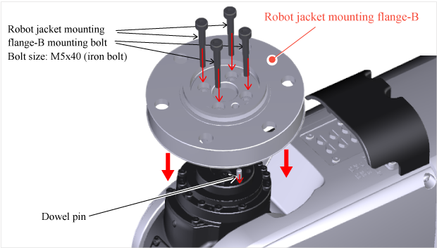 Fix the robot jacket mounting flange-B with the accompanied bolts and dowel pin.