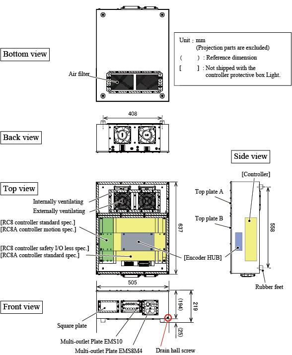 The figure below shows the names of the protective box Light components and the external dimensions.