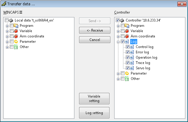 Log data checked in the robot controller is retrieved into WINCAPSIII in the data transfer screen.