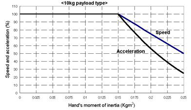 - If the moment of inertia around the T axis is 0.33 kgm2: Run the robot at 90% or less of the programmed speed and at 81% or less of the programmed acceleration.