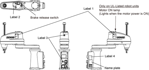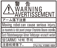 The robot unit has warning and caution labels pasted as shown below. They alert the user to the dangers of the areas on which they are pasted. Be sure to observe the instructions printed on those labels.
