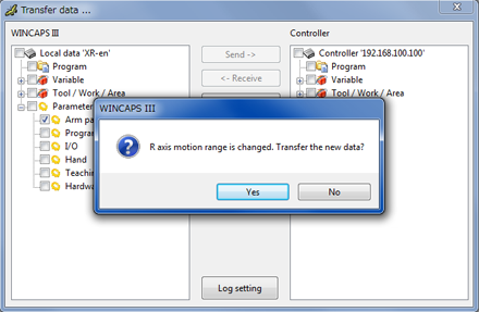 The following confirmation message appears since the R-axis motion range data held in the robot controller is different from the one specified in WINCAPSIII.