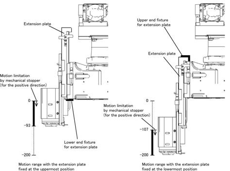 To change the motion range of the robot with the Z-axis stroke of 200 mm, fix the extension plate either at the uppermost or lowermost position.