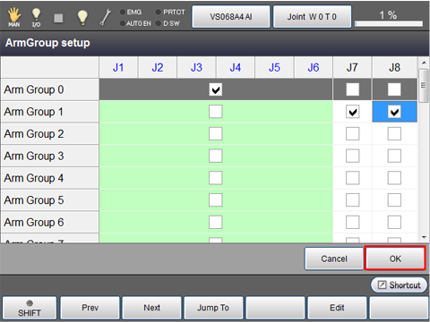 After all arm group settings are completed, press [OK] of the arm group setting window.