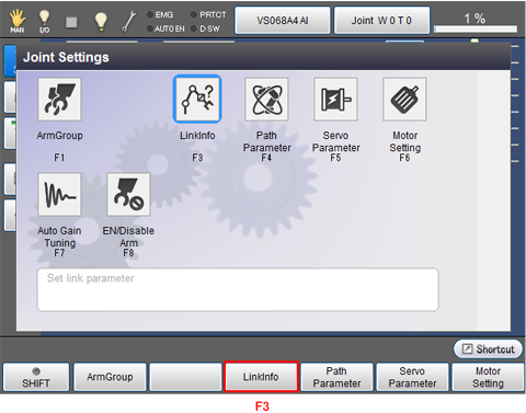 Operation path: Top screen-[F2 Arm]-[F12 Maintenance]-[F10 Joint Settings]-[F3 LinkInfo]