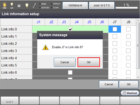 In the configuration shown above, the motions of extended-joints J7 and J8 affect those of the robot joints, so link the robot joints and extended-joints together.