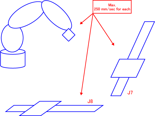 If the link info is set up between robot joints and extended-joint(s), the controller can limit the total motion speed of the linked joints to a maximum of 250 mm/sec. Note that the total motion speed differs from the actual composite speed since the controller does not take the motion directions of individual joints into account.