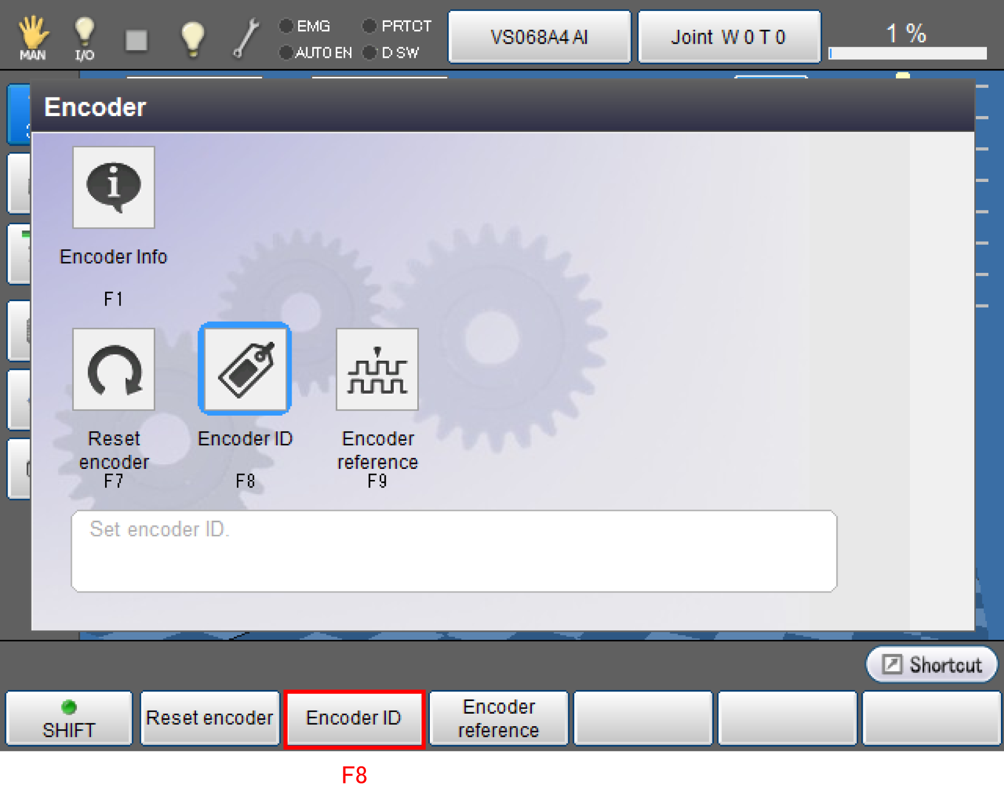 Top screen –[F2 Arm]-[F12 Maintenance]-[F2 Encoder]-[F8 Encoder ID]