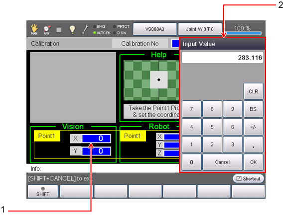 Touch the coordinate part (1) to display the numeric value input screen (2). Enter the vision coordinates (X, Y) read by the visual device and press [OK] button.
