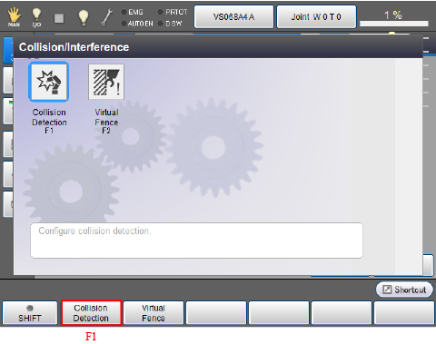 From the top window, press [F2 Arm] - [F6 Auxiliary function] - [F2 Collision/Interference] - [F1 Collision Detection].