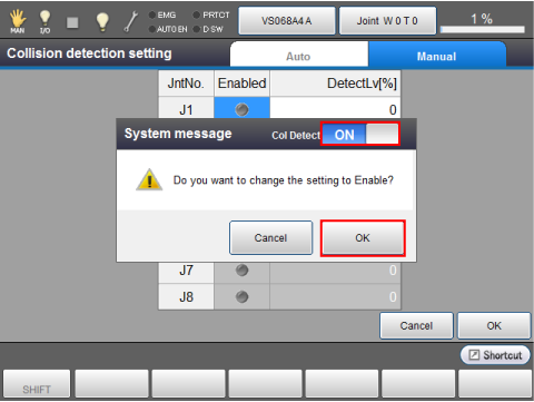 Use the teach pendant or command to enable/disable the collision detection function. The initial value is set to "disabled."