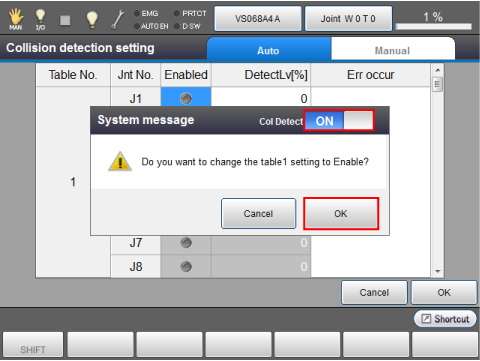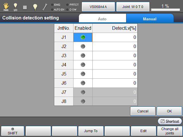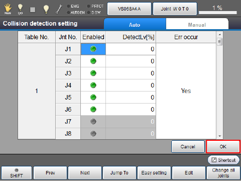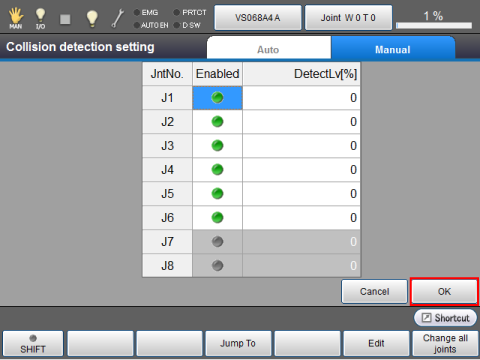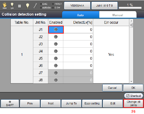 Select the axis numbers that you want to enable the collision detection function and press [F6 Change all joints].