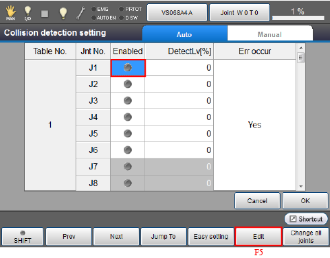 Select the axis numbers for which to enable the collision detection function and press [Enable] or [F5 Edit] for each axis number.