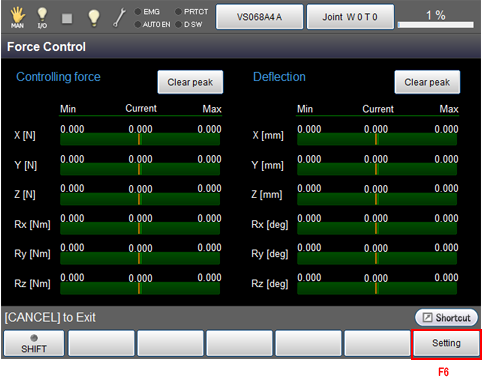 On the [Force Control] monitoring screen that appears, press [F6 Setting].