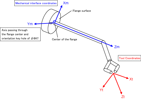 A tool mounting surface at the end of the robot arm is called a flange. Three-dimensional Cartesian coordinates whose origin at the center of the flange center are called mechanical interface coordinates.