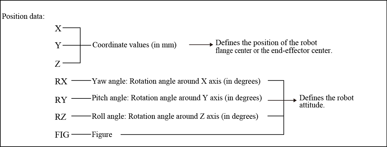 Position data refers to a set of data which includes RX, RY and five components of base coordinates (the work coordinates system if an work coordinates system is defined). Of these five components, three are robot flange center coordinates (the end-effector tip coordinates if an end-effector is defined) and two are current robot attitude components, as shown below.