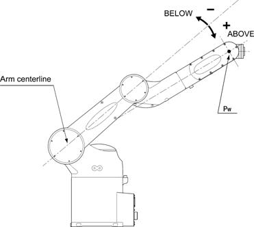 When viewed from the normal line on the side of the arm link, if point Pw exists in the left-hand side of the rotary axis of the 1st axis, the figure is LEFTY; if point Pw exists in the right-hand side, it is RIGHTY. In the figure shown below, the boundary is drawn with alternate long and short dash lines.