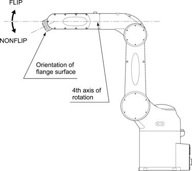 The robot can take two different 4th-axis figures--SINGLE 4and DOUBLE 4. If the 4th axis rotates by -180°<θ4≤180° in mechanical interface coordinates, the figure is SINGLE 4; if it rotates by 180°<θ4≤185° or -185°<θ4≤-180°, the figure is DOUBLE 4.