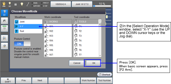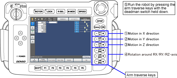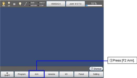 The current position can be checked by the teach pendant. To display the current position on the screen, press [F2 Arm]. This is optional, so you can operate robot arms without displaying current position.