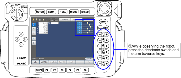 The arm corresponding with the operation of the J1 to J4 (4-axis robot) or J1 to J6 (6-axis robot) arm traverse keys will move.