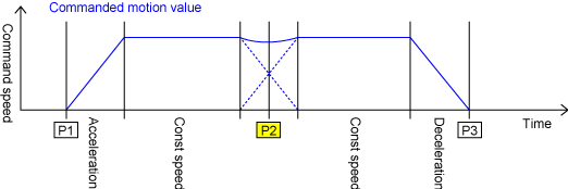 In the end motion, the robot judges that the tool end has arrived at the target position when it reaches the taught position P2 (called as the end position) and the command value to the servo system becomes the target one.