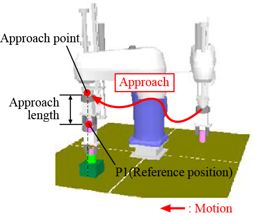 If a robot moves to a target position freely when it holds or places a workpiece, it might collide with peripheral devices and equipment. To prevent such collision, move the robot hand to the approach position that is away from the target position first, stop the position for a period of time, and then move to the target position straightaway.