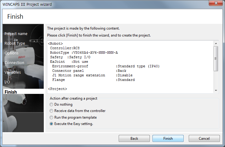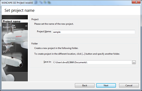 If the robot and the controller are set up, import one of projects held in the robot controller into WINCAPSIII to create a new project. - Project name and location