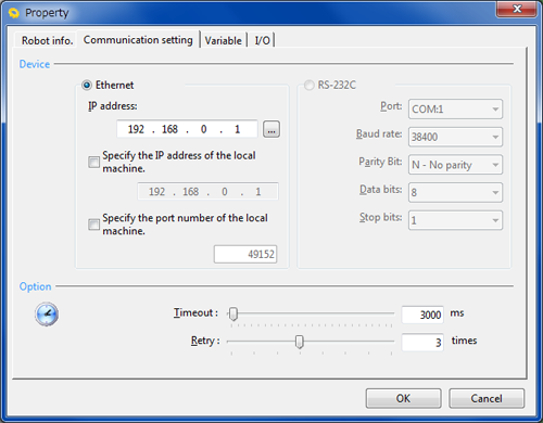 Make sure that Ethernet is selected and enter the IP address of the robot controller.