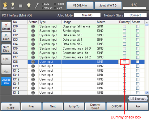 Once the [F4 Dummy Smart] is pressed, the [Dummy input setting] window appears. Select [IO8 is changed], and then press [OK].
