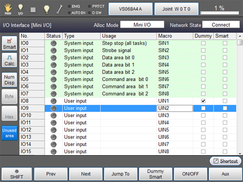 You can monitor the status of system inputs and outputs, user inputs and outputs, and internal I/O in real time. Also, you can simulate robot motions by forcibly turning on the user output signal, hand output signal, and internal I/O signal, or by turning on the dummy signals of user inputs and hand inputs.