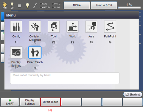 To stop the direct mode, press [F8 Direct Teach] on the Arm auxiliary functions screen.