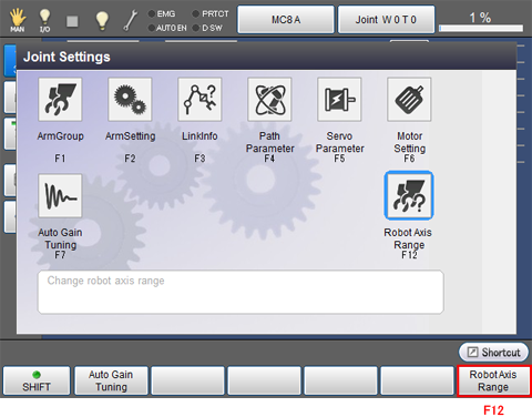 Access : Top screen- [F2 Arm] - [F2 Maintenance] - [F10 Joint Settings] - [F12 Robot Axis Range]