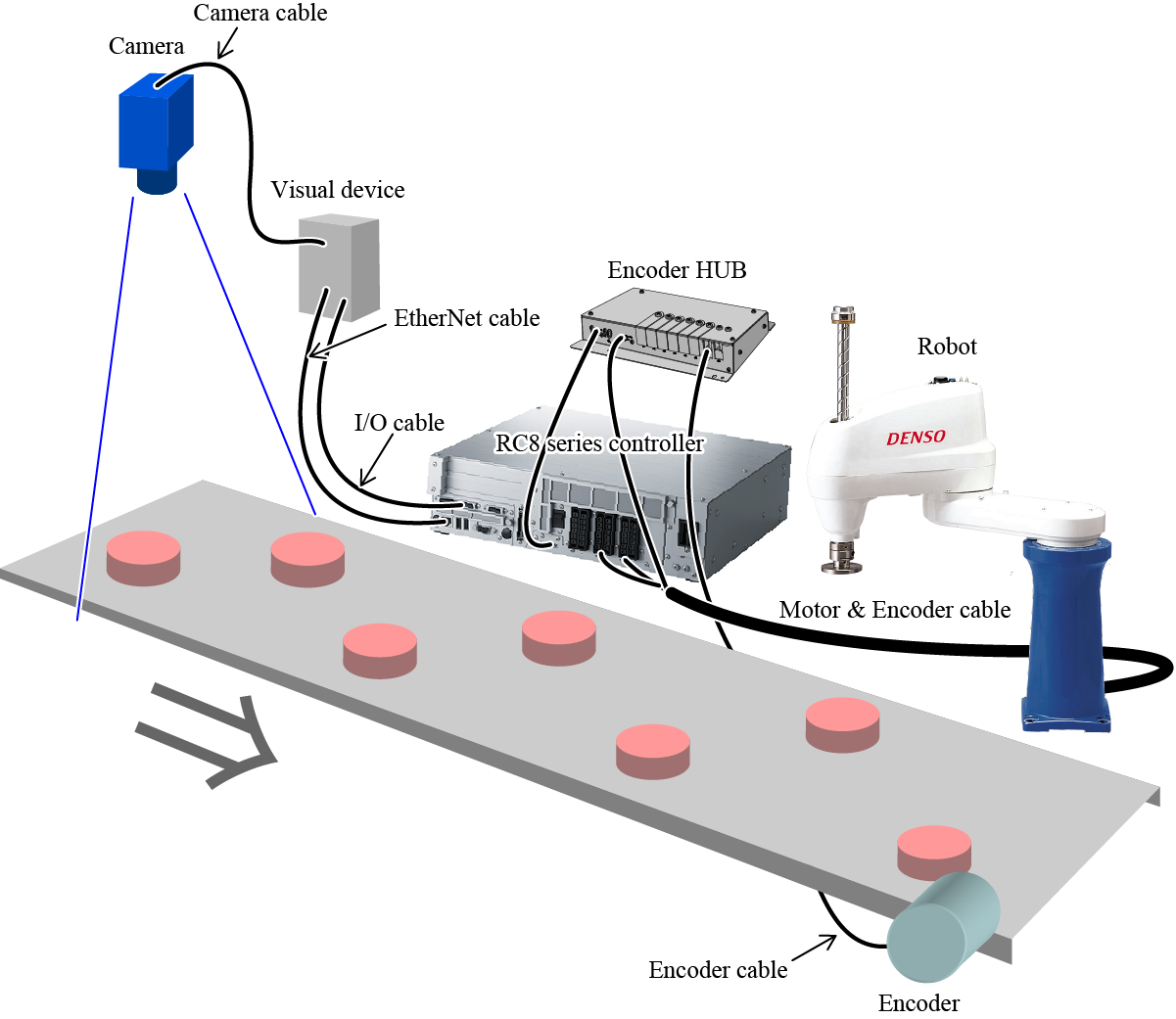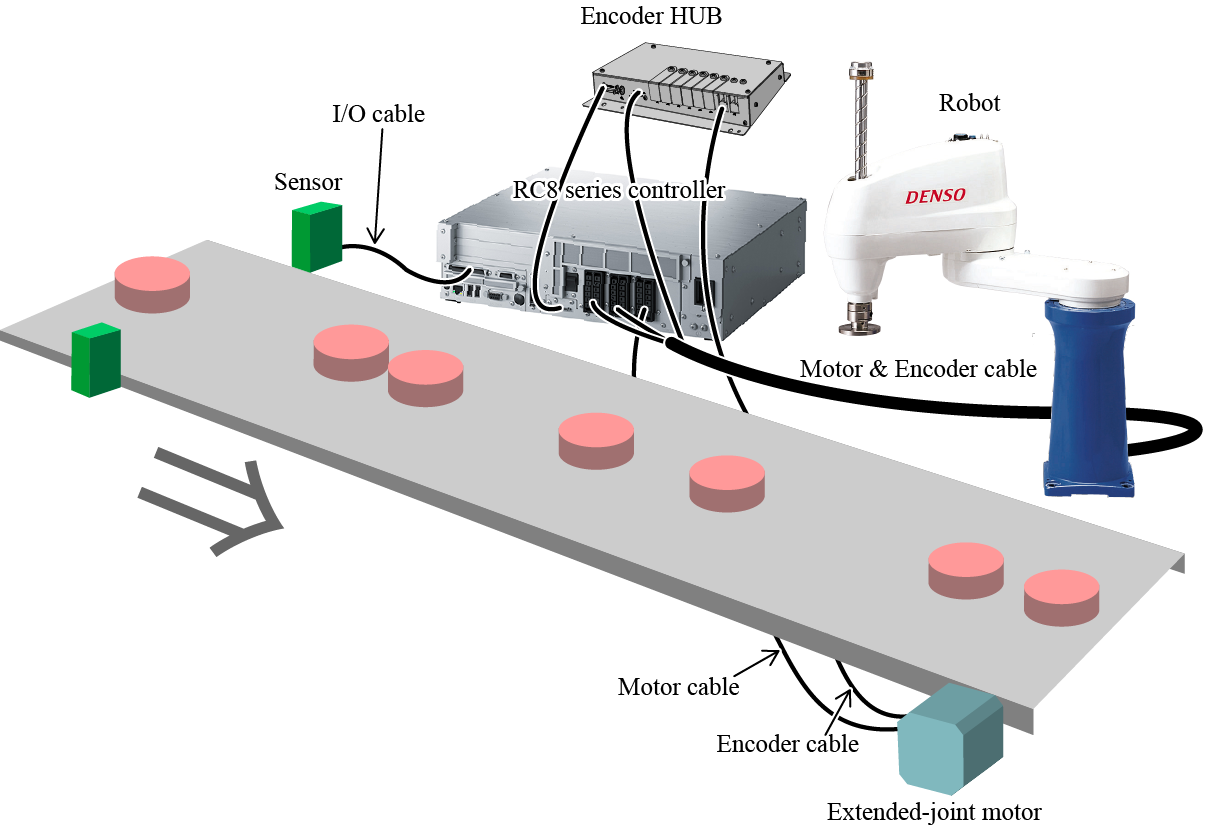 The difference between the conveyor tracking system and this system is the drive mechanism of the conveyor. The conveyor in this system is driven by the extended-joint. Other functions are the same as the conveyor tracking.
