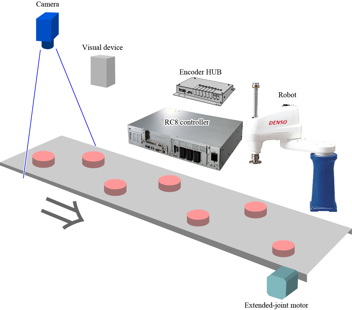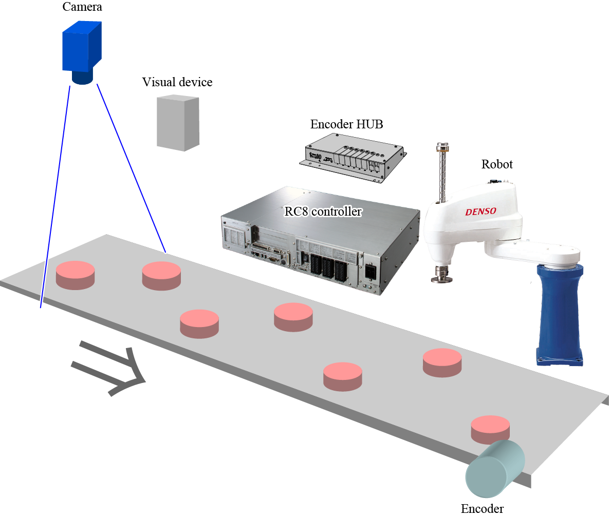The vision tracking system is applied to pick up workpieces which are placed on arbitrary position on the moving conveyor.