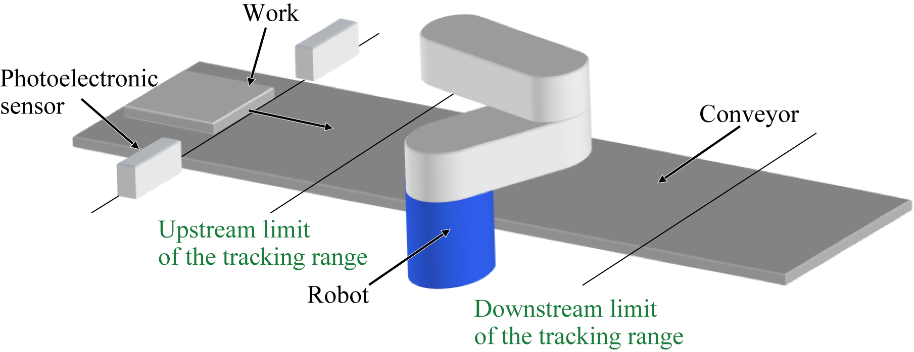 Upstream limit of the Tracking range Once a workpiece passes this limit, a robot starts the conveyor catch-up motion. [mm]