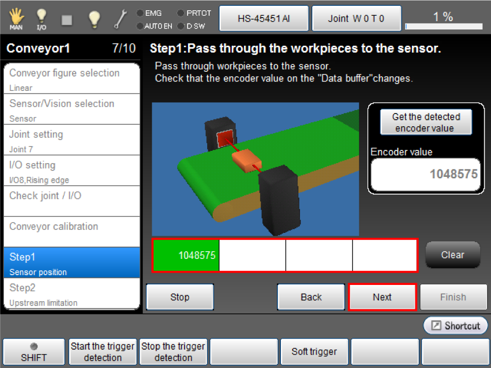 Check that the encoder value of the tracking buffer is increased when the workpiece passes through the sensor.