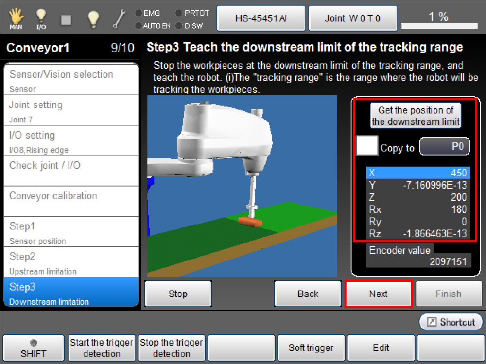 The obtained coordinates and encoder values on both of the upstream limit and the downstream limit are used to determine the conveyor feed rate and the direction. If you change the coordinate values by the method shown above, keep in mind that the change may affect the conveyor feed rate and the direction.