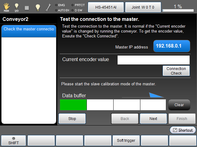 Start the conveyor then check whether the value of [Current encoder value], [Data buffer]changes properly. If the value changes, the setting is normal.