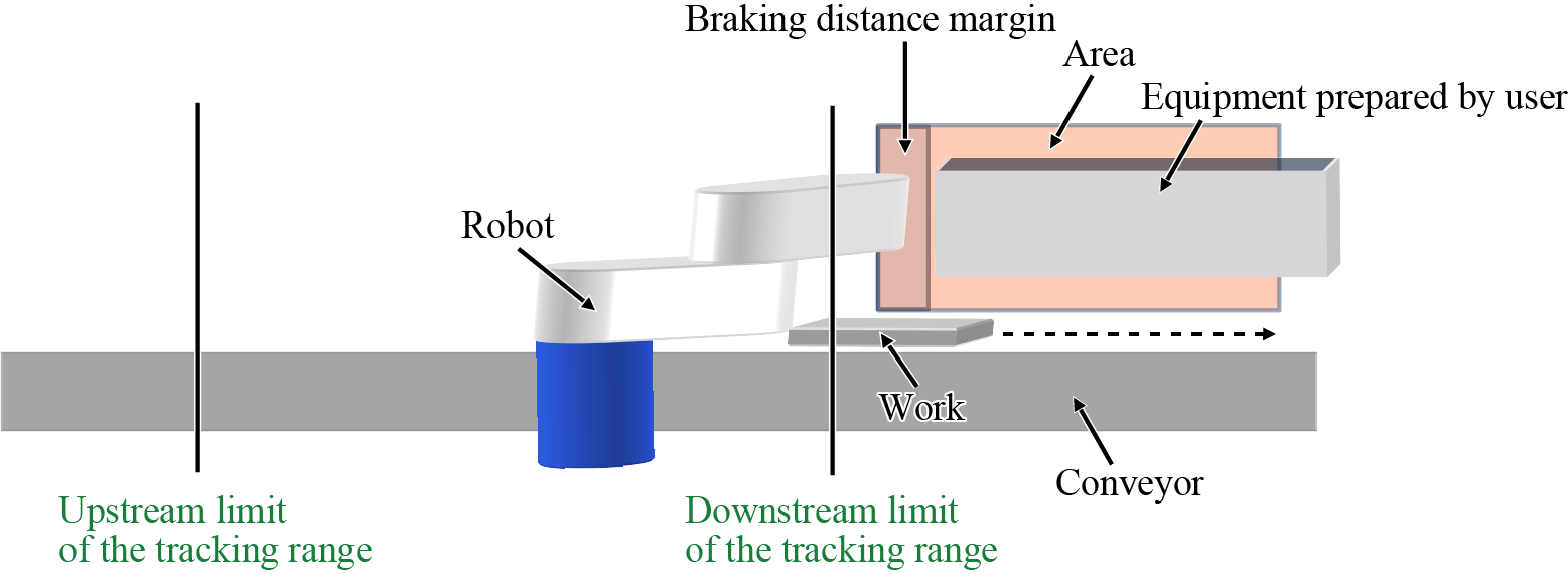 - If option2 setting is enabled, a robot moves across the Downstream limit of the tracking range. Please pay attention to avoid collisions with equipments placed behind the Downstream limit of the tracking range. It is recommended to perform collision check by using Area function to prevent unintended contact between robot and equipments.